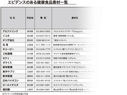 機能性表示食品制度発足から6年が経ち、素材各社が取得するエビデンスの質もさらに高まってきている。各社はターゲットを明確に見据えた研究を行うようになっている。エビデンス取得の目的は主に(1)機能性表示食品の届け出受理(2)エビデンスの深化(3)素材の可能性拡大─の三つ。(1)の機能性表示食品化で追求されるのは「何をどこまで表示できるか」ということだ。一方、機能性表示食品化が期待できない素材についても、素材会社が、(2)のエビデンスの深化のための研究を地道に続けるケースは少なからずある。動物試験で効果が確認されていた効果について、ヒト試験で再確認するケースもあるし、ヒト・動物で確認されている効果について、メカニズムの探索を行うケースもある。(3)の素材の可能性拡大のための研究も重要だ。健康に対する効果が確認されていた素材について、美容効果のエビデンスを取得し、訴求点を拡大するといった取り組みだ。エビデンスの取り方が、マーケットの需要とマッチすれば、一躍ヒット素材となる可能性もある。エビデンス取得に真摯(しんし)に取り組む各社の一押し素材を紹介する。