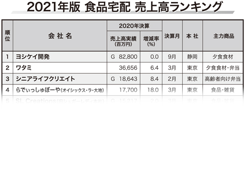 【食品宅配売上高ランキング 2021年版】 実質伸び率はプラス8.7%/外出自粛で状況一変苦戦のミールキットも増収に(2021年10月14日号)