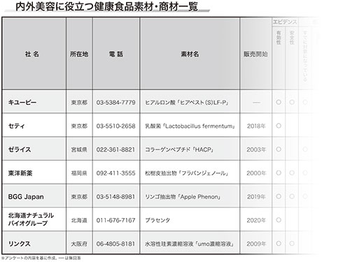健康食品と化粧品で、内と外の両面から?美?を実現しようというコンセプトの商品が増えている。そんな中、美容効果のエビデンスを取得した食品素材も増えている。保湿から美白、抗酸化、抗糖化、光老化対策、弾力、毛穴、育毛・美髪、ダイエットまで、美容関連のエビデンスの取得の方向性はさまざまだ。近年は、美容効果を備えた機能性表示食品対応素材も増えている。実力派の美容食品素材を一挙に紹介する。