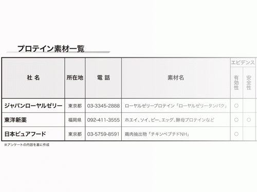 プロテインは、近年筆頭に上がるヒット健康食品素材といってよいだろう。アスリート向けだけでなく、ロコモティブシンドロームやサルコペニアの悩みを持つ高齢者向けの商品開発も進んでいる。美容やダイエットの目的で、食事の代替としてプロテインを摂取する人も増えている。需要の増加に伴い、多様なプロテイン製品が、市場で販売されるようになっており、プロテイン製品にはより一層の差別化・高付加価値化が求められるようになっている。差別化された製品の開発に貢献する、プロテイン原料や副原料、受託製造サービスを一挙に紹介する。