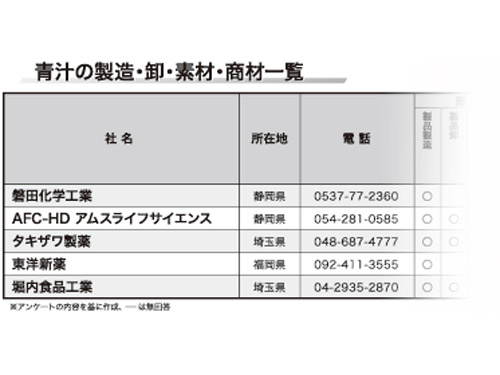 長きにわたって国民に愛され続けているのが青汁だ。一般的なサプリメントに抵抗感があるが青汁だけは毎日飲んでいるという人も少なくないのではないか。青汁の市場が成熟する中、青汁製品には、より一層の差別化が求められるようになっている。差別化の方向性は多様だ。産地や製法で差別化する方法もあれば、味や飲みやすさ、溶けやすさで差別化する方法もある。青汁素材の数で勝負する企業も、機能性を表示することで差別化を図る企業もある。配合する副素材で差別化を図る方法も一般的だ。差別化できる青汁の開発に貢献する青汁関連企業を一挙に紹介する。