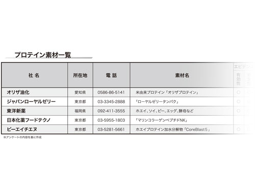 プロテインの人気は引き続き高い。プロテイン市場では、今日も熾烈な競争が行われている。市場に飽和感が漂う中、一歩抜け出す差別化が求められていると言っても良いだろう。少量で効果を発揮するプロテイン素材も出てきているようだ。一方で、プロテインの効果を増強する副素材や、飲みやすさをサポートする副素材も出てきている。差別化されたプロテイン製品の開発に役立つ素材や、OEMサービスを紹介する。