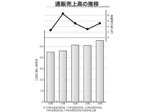 【通販・通教・EC 2014年売上高ランキング】 〈上位300社売上高調査〉実質伸び率は5.2%に拡大/合計売上は5・5兆円超に