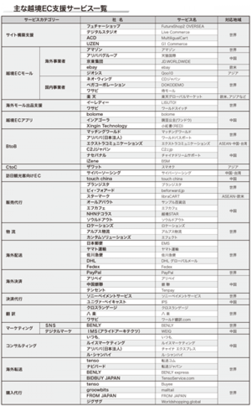 経済産業省の発表によると、日本から中国へのネット通販流通額は14年の6064億円から、18年には1兆3943億円になると予測されている。また、アマゾンのデータでも、14年から15年にかけて日本から海外への出品者数は約2倍、海外から日本へは約2.5倍に急増した。ネット通販で海外に進出しようとする動きが活発化する中、越境EC支援サービスは多岐にわたり、サービス内容も進化を続けている。各社の越境EC支援サービスの強みや、対応しているエリアなどを取り上げる。