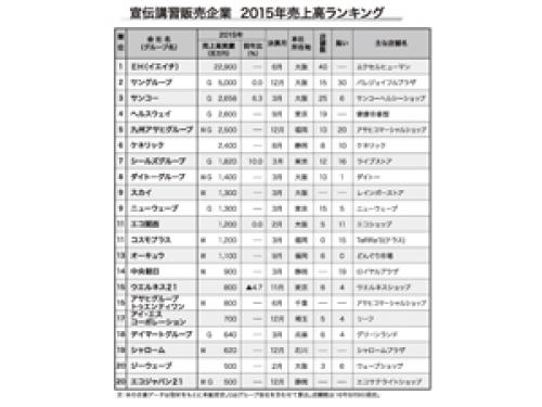 本紙は2015年度(15年4月~16年3月の間に迎えた決算期が対象)の宣伝講習販売企業の売上高を集計し、ランキング化した。本紙推定を含めた、14年度と比較可能な21社合計の売上高は、前年比3.2%減の528億3800万円だった。