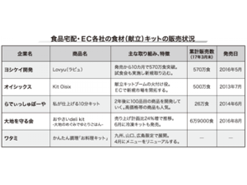 食品宅配・EC業界では、共働き世帯や子育て層の取り込みを狙う目的で、夕食(献立)キットの販売が活発化している。ヨシケイ開発では16年5月に発売した「ラビュ」が10カ月で570万食を突破。オイシックスでも13年7月に発売した「Kit Oisix」が3月末時点で500万食を超えるなど、各社は順調にキットの販売を伸ばしている。食品宅配企業では、まだネットによる受注の割合が高くないことから、スマホからの注文をしやすくする利便性向上が課題となっている。キット商品を販売する4社の動向を取り上げるほか、食品ECに新規参入したバルーンの社長インタビューを紹介する。