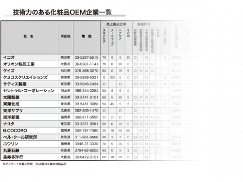 化粧品OEM業界は相対的に見て活況のようだ。一時は内製化を推進していた、自社ブランドを販売する化粧品メーカーが、OEMを有効活用するようになったことも一つの要因。大手OEMメーカーは、既存設備では受注を賄いきれなくなり、新工場の建設など設備増強に動いている。大手が受けきれない中小ロットの案件は中小OEM事業者にも流れてきており、全体の活況につながっているようだ。ただ、好調なときも、不調なときも、問われるのがOEM会社の〝技術力〟だろう。独自の技術力を持つ化粧品OEM企業を紹介する。