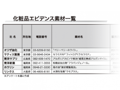 「化粧品業界のエビデンスレベルは、もはや医薬品レベルにもなってきている」とはある素材メーカーの発言だ。実際に、化粧品のエビデンスのレベルは年々高まっており、遺伝子発現試験などを使って詳細なメカニズムの分析を行うケースなども珍しくなくなってきた。エビデンスの充実ぶりは「効能が一定水準までしかうたえない化粧品で、これだけのエビデンスをどう表現すればいいのか、悩ましい」と頭を抱える販売会社がいるほどだ。化粧品業界は一方で、「化粧品について動物試験を行ってはならない」という、世界の趨勢といかに折り合いをつけるかが問われるようになっている。エビデンス豊富な化粧品素材を紹介する。
