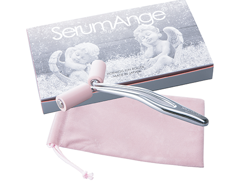 「セラムアンジェ」はローラーに「ホルミシスパウダー」を練り込んだ美容機器です。ホルミシスパウダーは、約2センチメートル四方に低線量放射線を放っています。ラドンガスを発生する温泉のような作用があり、マイナスイオンが発生します。このため、活性酸素の抑制と血行促進効果が期待できます。