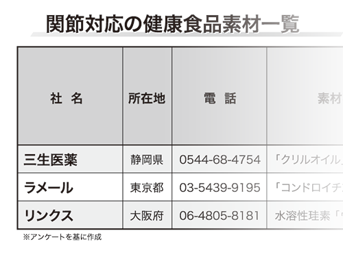 「関節」分野は、健康食品の中でも特に人気が高い。日々感じる関節の悩みを、少しでも緩和したいと願うのは、ごく当たり前の感情といえるだろう。市場には、優れた効果を持つ関節対応素材がさまざま現れている。グルコサミンを中心に形成されてきた感がある「関節対応サプリ」の市場だが、機能性表示食品制度の登場により、潮目がやや変わりつつある。エビデンス豊富な関節対応素材を紹介する。