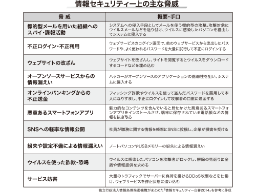 企業にとって情報防衛は重要な経営課題になっている。サイバー攻撃の手法が多様化している上、情報漏えいの経路も複雑化しつつある。社内資料や顧客情報が流出したことで損害を被る企業は後を絶たない。企業は自社のビジネスモデルや予算を考慮し、できることからセキュリティー強化に取り組むことが求められている。