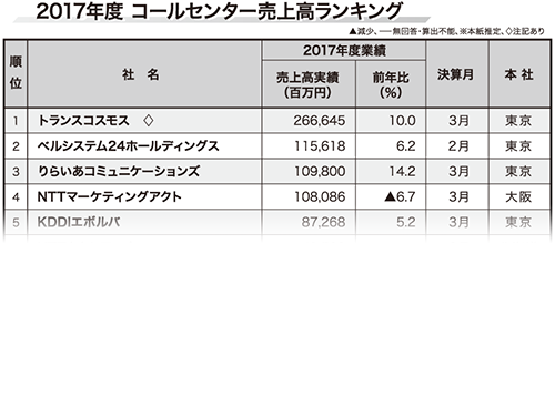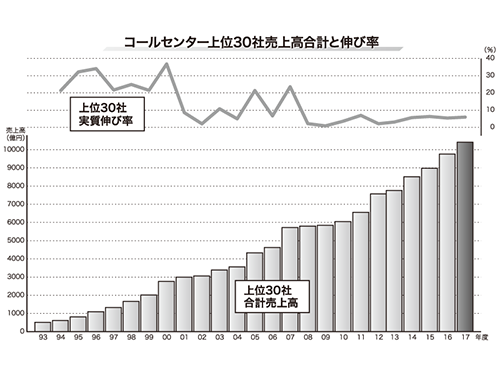 日本流通産業新聞社はこのほど、電話応対業務を受託するコールセンター企業の売上高を集計した「第25回コールセンター売上高調査(2017年度)」をまとめた。ランキングに掲載した33社の合計売上高は、1兆440億9400万円となり、前年実績と比較可能な23社で算出した実質伸び率は6・0%だった。実質伸び率は前年調査と比べると0・5ポイント増だった。伸び率は前年、前々年と同様に伸長となったが、合計売上高は1兆円の大台に到達し、市場規模は拡大している。