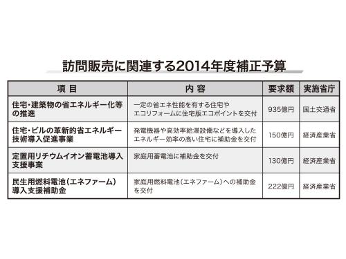 政府の経済対策を盛り込んだ2014年度補正予算が2月3日、成立した。住宅版エコポイントや蓄電池への補助金など訪販にも関連する予算は総額約1400億円に上る。補助金は消費者の購買を強力に後押しするだけに、訪販市場の活性化につながりそうだ。