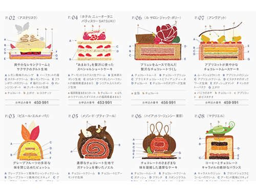 ケーキの断面をイラストで紹介し、ケーキの特徴を分かりやすく伝えている。カタログを見たユーザーがツイッターで、「全ケーキの断面図が掲載されている」と、誌面の画像付きで投稿したところ、5万件以上リツイートされたという。