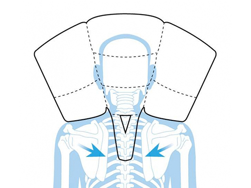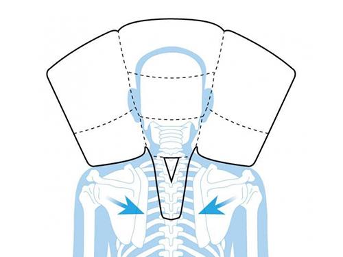 扇形の枕を八つに分割しており、各部で高さに変化をつけている。仰向け時には、肩甲骨の間にクッションが入り込むことで、肩甲骨を内側に閉じ、胸部を広げる。