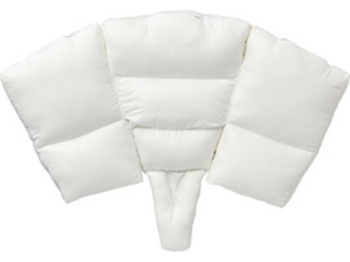 左右には横向きに寝るためのクッションを設けた。布団との隙間を埋め、肩の負担を軽減するために、首に接する部分のクッションはやや高くした。扇状の枕の各部が体にフィットするため、寝返りもしやすい。