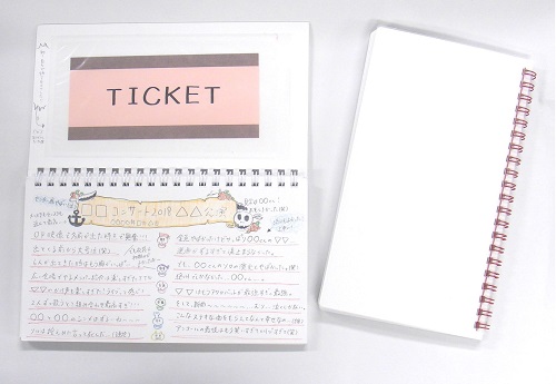 リングノートの見開きページの片方に、ライブチケットを保存する透明なポケットを付けた。反対側は、ライブの感想や、その日の出来事を書き込むスペースとなっている。ノート1冊に20枚のチケットを保存できる。