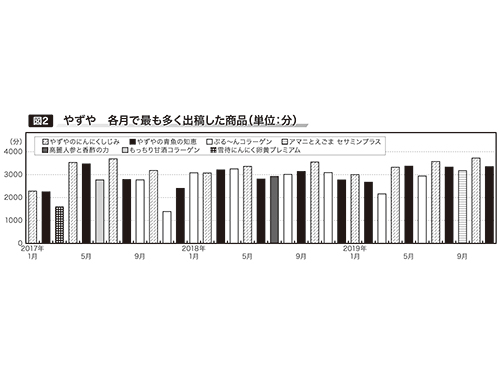 健康食品の各商品の出稿数をグラフ化して分析したところ、一部商品の出稿方法にユニークな特徴があることが見えてきた。