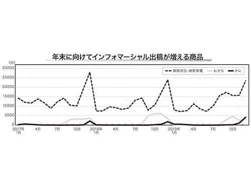 年末に向けた2~3カ月は、大掃除や正月などに関する特定の商品の出稿が増える時期だ。グラフを見ると実際に、掃除用品・掃除家電、おせち、カニといった商品のインフォマーシャルの出稿量が、年末になるたびに圧倒的に増えているのが分かる。