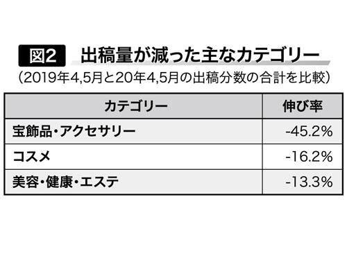 伸び率が高いカテゴリーを並べたのが図1だ。一見すると、各メディアでも取り沙汰されていたように、ステイホームに必要な、食品や、手料理・掃除のための道具などの需要が伸びたのかな、という印象を受ける。一方、伸び率を下げたカテゴリーをまとめた図2を見ると、外出機会がなくなった関係で、コスメやアクセサリーなどの需要が減少したとも見受けられる。
