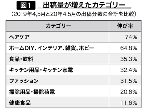 では、どのような商品の出稿量が増えていたのか、もう少し具体的に見てみよう。カテゴリーと同じく19年と20年の4、5月の合計で比較してみる。