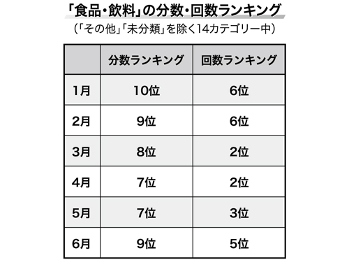 そういった視点をもって1~6月の放送分数・回数をカテゴリー別に見ていくと、目につくのが「食品・飲料」だ。14カテゴリー(「その他」「未分類」を除く)をランキング化すると、表1の通り、放送分数ベースのランキングでは毎月7位以下で、9位、10位の月もある。分数自体も上位から中位のカテゴリーと比較すると、かなり少なくなる。一方で放送回数は、常に6位以上。特に3月以降は分数と回数のランキングの差が顕著だ。