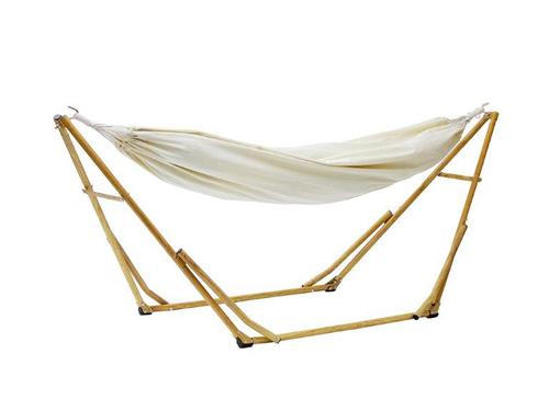 同商品の特徴は、商品名の通り3種類の使い方ができる点にある。ハンモックを取り付ける台座の幅を変更することで、チェアとして使用することもできる。ハンモックやチェアとして使用しないときは生地を取り外し、付属の棒をつけることで、ハンガーラックとして使用することもできる。折りたたみ式になっており、付属のバッグに収納すれば、手軽に持ち運ぶこともできる。アウトドアでの利用にも便利な商品となっている。生地のカラーは5色から選ぶことができ、価格は税別1万8500円となっている。