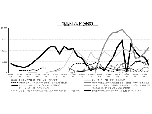 1日に何千分、何万分と流されるインフォマーシャル。よく見る商品もあれば、たまに目新しい商品も登場する。しかし、どんな商品も放送回数や放送分数、放送時期などをじっくり調べてみると、売れる理由や各社の戦略・努力が見えてくる。今回は、ユニークな商品も多い「キッチン用品」の傾向・動向を探ってみた。