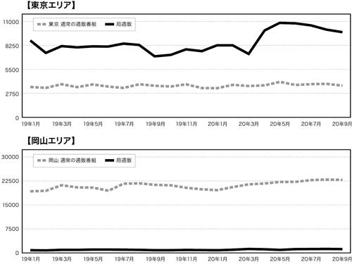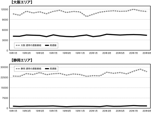 そうした前提を踏まえた上で、東京、大阪、名古屋、福岡、札幌、広島、宮城、静岡、岡山の9エリアにおける”通常の通販番組”の放送分数を比較してみた。すると、東京エリア以外の8エリアでは確かに、”通常の通販番組”の放送分数が月間1万~2万分程度と高い水準で推移していることが分かった。その一方で東京エリアは、”通常の通販番組”が月間4000分程度と、相対的に低水準で推移していることが分かった。