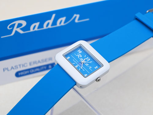 「SEED Radar 消しゴム 文具コラボッチ(リストウォッチ)」のカラーリングは、鮮やかな発色のブルーと、温かみのあるホワイト。海外ユーザーからも引き合いが多いという。青と白がコントラストしている配色も、海外のユーザーからの人気の一因と見ている。特に多いのは、香港などアジア系のユーザーだという。