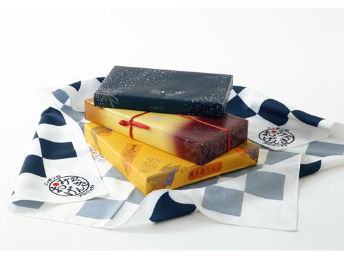 「白い恋人」「萩の月」「博多通りもん」を詰め合わせただけでなく、オリジナル風呂敷を付け、オリジナルデザインの箱に入れて届けている。