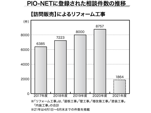 国センが5月21日に発表した、「訪問販売によるリフォーム工事・点検商法」によると、20年度の「訪問販売によるリフォーム工事」の相談件数は、8757件で、前年度よりも757件多い。「点検商法」の相談件数は7009件で、19年度よりも1250件急増している。