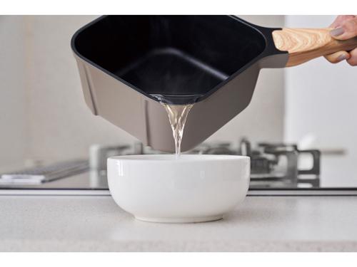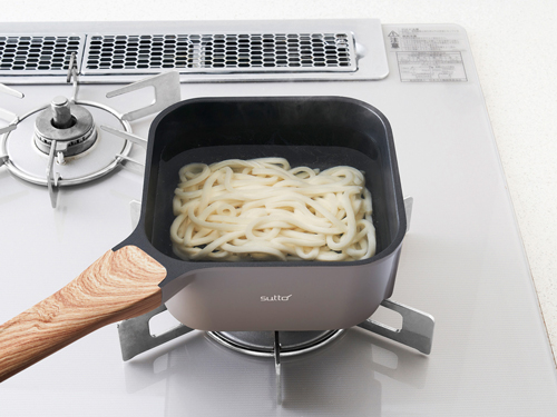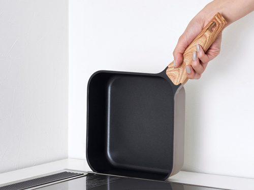 フライパンの取っ手(ハンドル)は角に設置している。収納したフライパンをいかに楽に取り出しやすくするか検証した結果だという。四角い形状と、角にハンドルを付けたことで、スープや具材が注ぎやすい。四角い形状により、レトルトパックや冷凍うどんがきれいに入ることもポイントになっている。