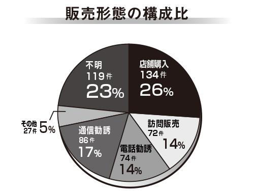 販売形態別では、店舗購入の134件に次いで、訪問販売が72件と目立った。相談者の構成比では、家族や友人など家族以外の相談が約2割を占めた。