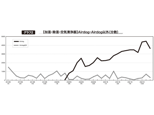 グラフ2を見ると分かるが、「Airdog」の出稿は、20年3月に始まった。当初は月間30分の出稿だったが、その後放送分数を増やしていき、同年12月には出稿分数が2218分に、21年12月には3648分になっている。