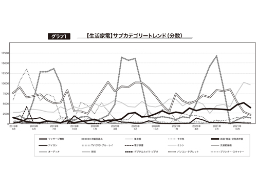 インフォマーシャル調査会社のハニーマスタード(本社東京都)がまとめた「生活家電」分野のインフォマーシャル出稿状況のデータ(グラフ1参照)を見ると、2020年春あたりから、空気清浄機類を含む「加湿・除湿・空気清浄器」の放送分数が伸びていることが分かる。ただし、空気清浄機だけの出稿分数を確認できない。そのため、商品ごとにデータを見てみることにしよう。