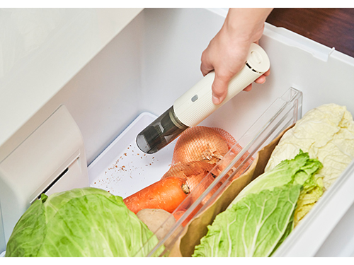 引き出しや冷蔵庫の奥にたまった、普段は拭き取りづらいゴミも吸い取りやすい。バッテリーの充電は専用の収納台座でできる。付属のブローノズルや、すき間ノズルも一緒に収納できる。
