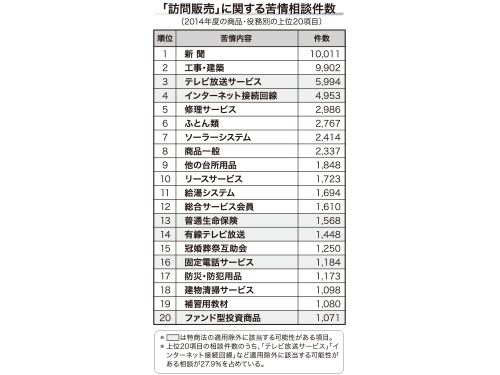 14年度における「訪問販売」に関する苦情・相談のうち、商品別で上位20項目の合計は5万8111件だった。この中で適用除外に該当する可能性が高い案件は1万6218件。その割合は27・9%に上る。