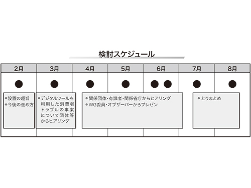 事務局では、「SNSで情報商材を購入し、さらに高額な契約を勧められた」「オンラインサロンを契約したが、事業者の住所や電話番号が分からない」といったトラブル事例を提示。4月以降、関係団体や有識者、関係省庁からヒアリングするほか、オブザーバーからのプレゼンテーションを経て、8月をめどに取りまとめる。