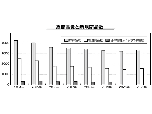 ちなみに、長く愛用を続ける商品が多いと考えられるのが、「健康食品」や「コスメ」だ。「健康食品」の新規商品数の割合は38.1%、「コスメ」は46.6%。成分やパッケージのリニューアルなどで、商品名の一部が変更された場合も新規商品としてのカウントになるため、すべてがまったく新しい商品になったわけではない。リニューアルして商品を新しく見せたり、パワーアップさせたりすることも、やはり消費者を引き付けておくための重要な要素になるのだろう。