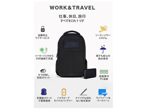 仕事や旅行などに便利な幅広い用途がある。外出時には、太陽光パネルによってスマートフォンやパソコン、カメラなどが充電できる。小型蓄電池も内蔵しており、日中充電して夜間に使える。