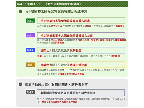 川崎市は五つの制度から、太陽光発電の導入を進めていく=制度の図参照。なかでも、制度(1)「特定建築物太陽光発電設備等導入制度」と、制度(2)「特定建築事業者太陽光発電設備導入制度」が鍵となりそうだ。この二つの制度は太陽光発電を販売する企業にとってもプラスに働く内容といえる。