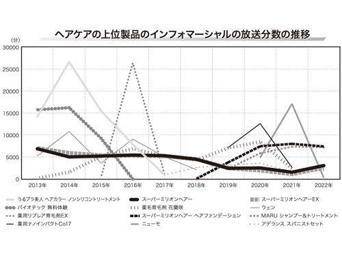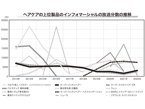 実は、ヘアケアのカテゴリーを調べてみたところ、2013年(インフォマーシャル調査会社のハニーマスタードがデータ収集を開始した頃)から22年までインフォマーシャルの出稿を続けている商品は、放送分数の上位数十社のうち「スーパーミリオンヘアー」「スーパーミリオンヘアーEX」のみであることが分かった。