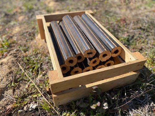 1本の重量は700~800グラムで、燃焼時間は1時間程度ある。炭などと違い手に汚れが付きにくく、持ち運びしやすい点も特徴だ。