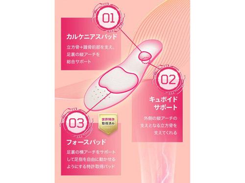 インソールは、足裏の部分がアーチ状になっており、立方骨と踵骨を支える構造。特許を取得している。「立方骨をサポートすると、足の指が自由に使えるようになり、快適で歩きやすくなる」という。