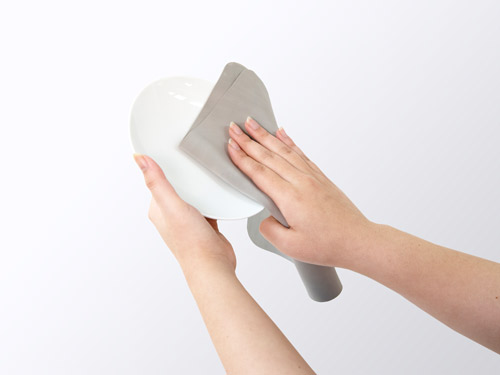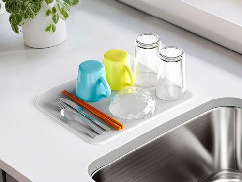 新商品の「STTA超速乾・超吸水 水切りマット&クロス」は、「スポンジシート」と「シリコーンマット」の2層構造。洗った後の食器などを置いて使う想定だ。「スポンジシート」は柔らかいため、キッチンクロスとして食器や調理台を拭く際にも使える。
