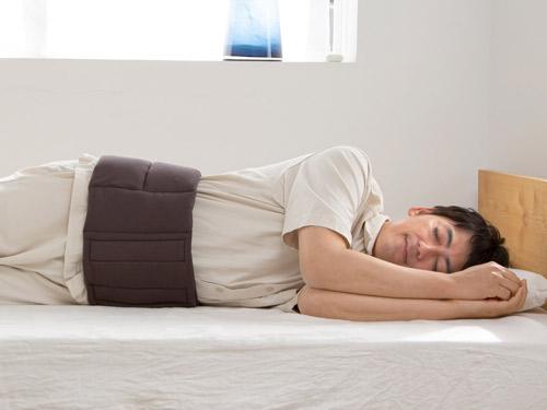 腰の下に敷いたり寝たり腹巻のように腰に巻いても使える2ウェイ仕様だ。仰向け寝、横向き寝でも、腰のカーブにあわせて物理的にサポートするということで、朝まで快適に眠れるという。