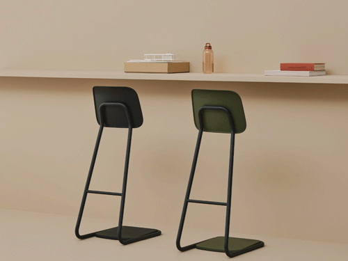 「スタンチェア」は、つま先がゆるやかに上がり、背もたれが腰から尻を支える。足と腰を支える2点サポート構造で、通常の立ち姿勢では足腰にかかっていた負荷を分散する。人間工学的デザインで健康的なスタンディングワークを実現した。