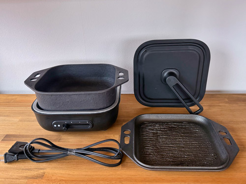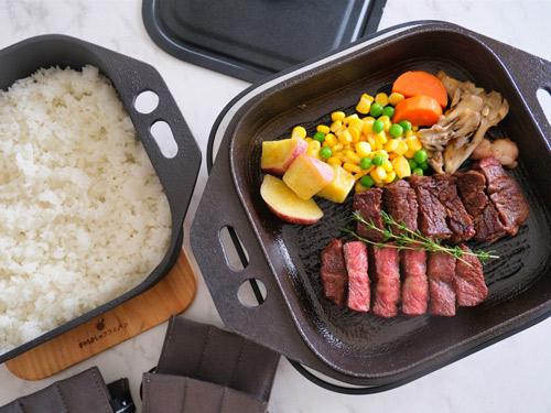 「おもいのフライパン」シリーズは、鋳物の技術を生かした熱伝導率や蓄熱性の高さにより、肉をおいしく焼けるのが特徴だ。新商品の「おもいの深鍋スクエア電気卓上コンロ」では、深鍋でコメを炊いたあと、ひっくり返した鉄板で肉を焼くという使い方ができる。