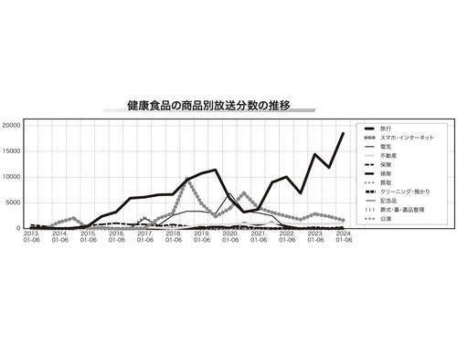 このうち、放送分数が圧倒的に多いのが「健康食品」であることは周知の通りで、2023年の放送分数は135万1106分だ。それに対して、「その他」は3万3714分で、商品も放送分数も非常に少数派であることが改めて理解できる。